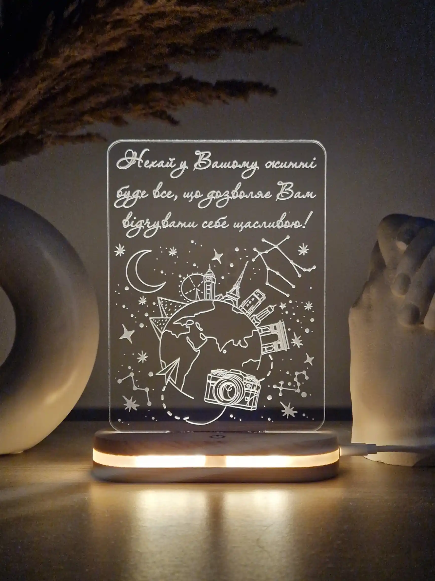 Індивідуальне гравіювання: Максимально швидке та ефективне гравіювання персоналізованого повідомлення чи ім’я робить цей світильник ідеальним подарунком на будь-який привід. Зверніться до нас, і ми зробимо все можливе, щоб ваші індивідуальні надписи були готові якнайшвидше, не займаючи багато часу. (Приклади гравіювання на фото)