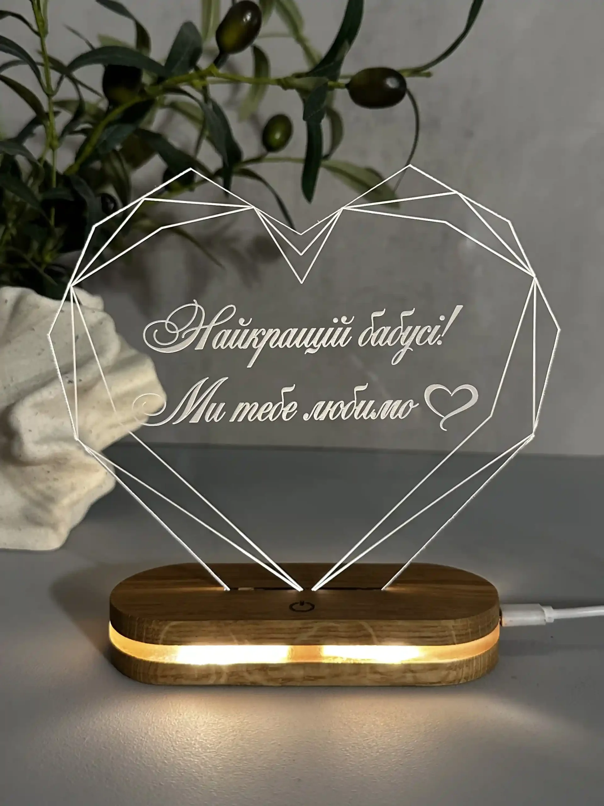Індивідуальне гравіювання: Максимально швидке та ефективне гравіювання персоналізованого повідомлення чи ім’я робить цей світильник ідеальним подарунком на будь-який привід. Зверніться до нас, і ми зробимо все можливе, щоб ваші індивідуальні надписи були готові якнайшвидше, не займаючи багато часу. (Приклади гравіювання на фото)