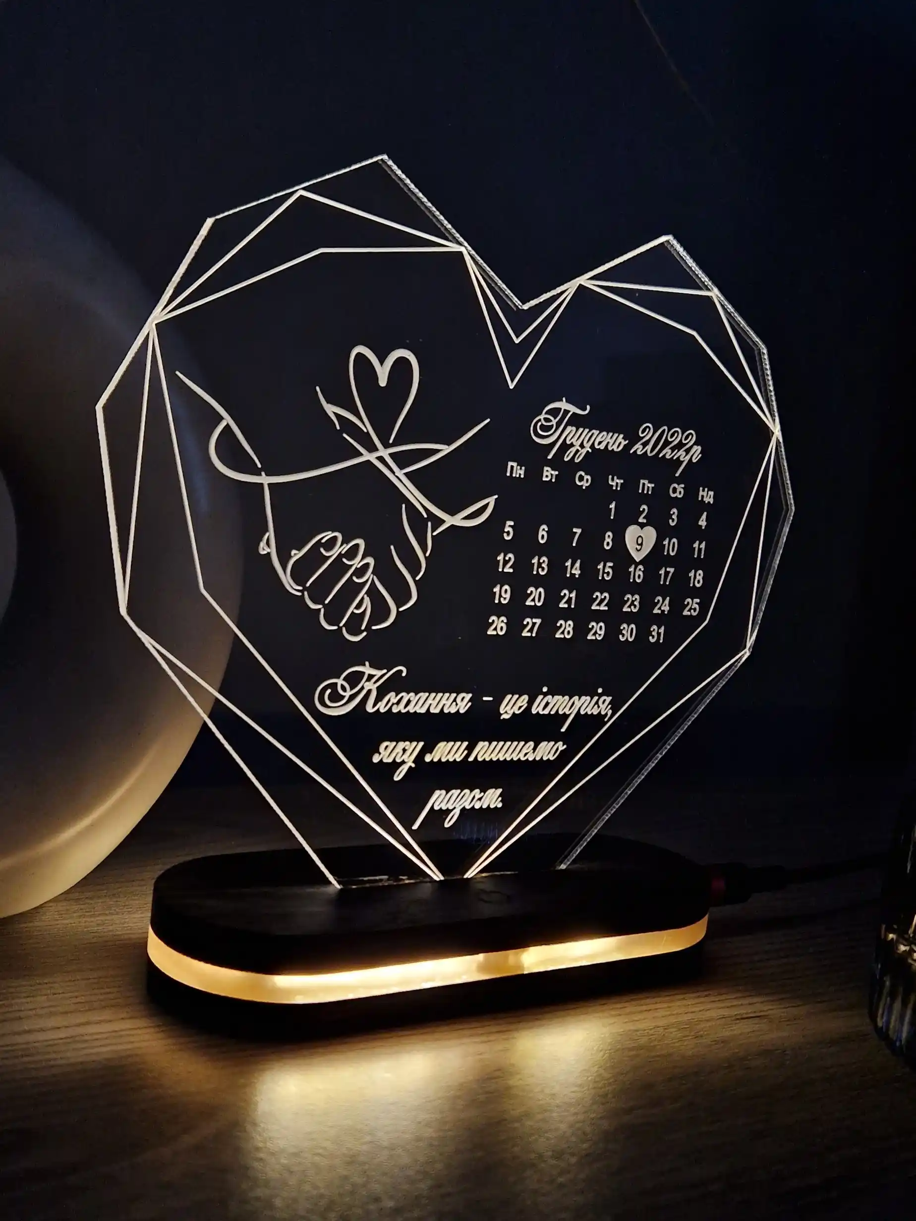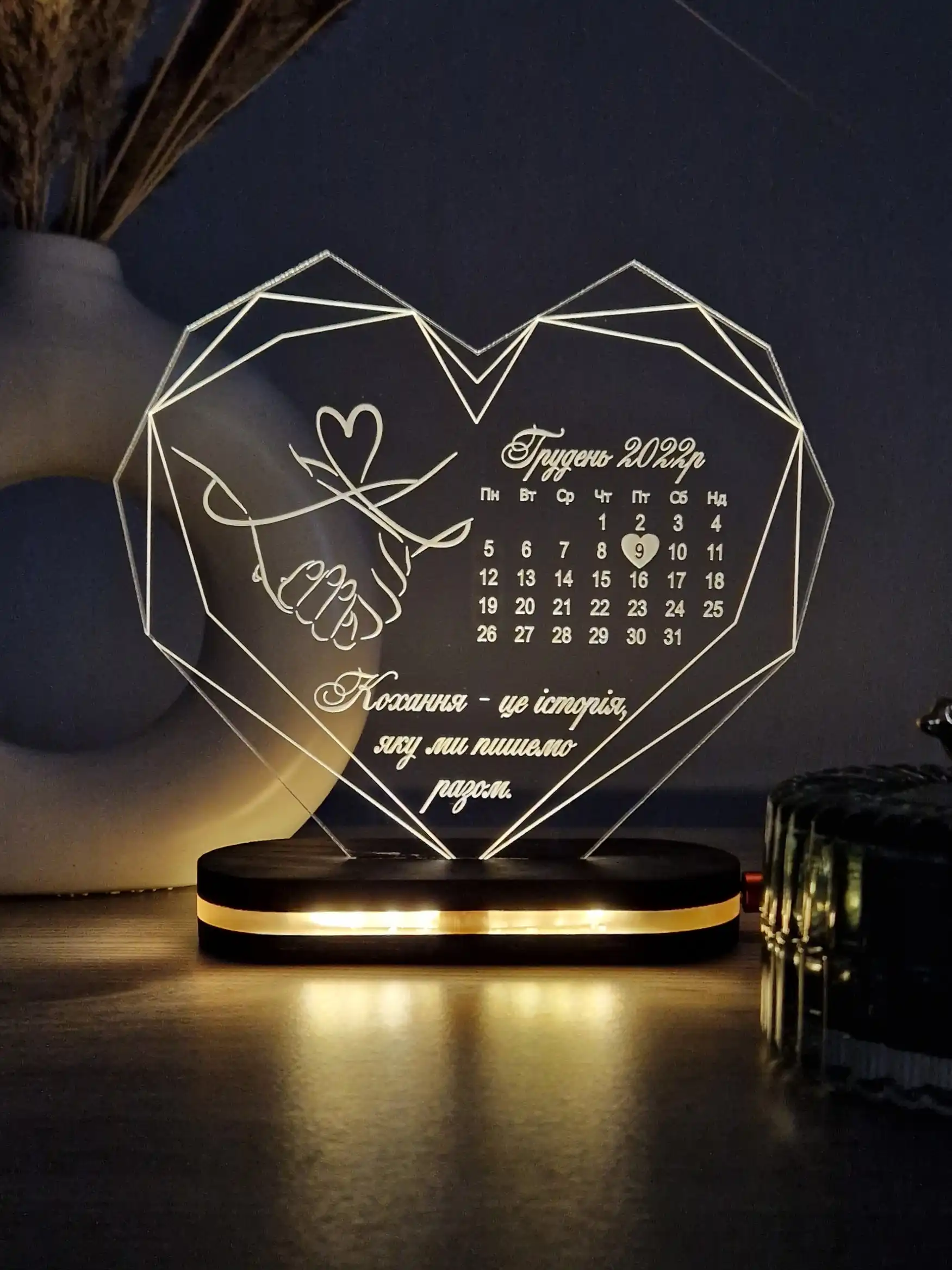 Індивідуальне гравіювання: Максимально швидке та ефективне гравіювання персоналізованого повідомлення чи ім’я робить цей світильник ідеальним подарунком на будь-який привід. Зверніться до нас, і ми зробимо все можливе, щоб ваші індивідуальні надписи були готові якнайшвидше, не займаючи багато часу. (Приклади гравіювання на фото)
